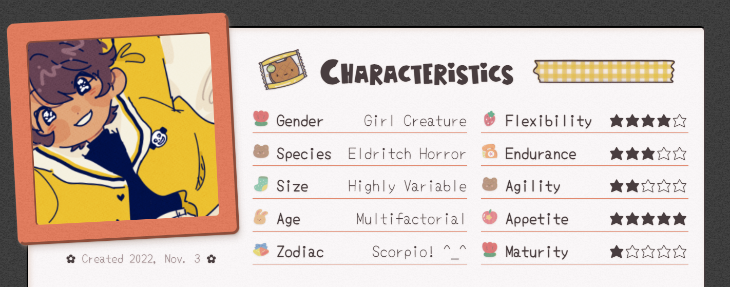 That would be such a downer ending to this entry, so I'll wrap up with a preview of Gokiburi-chan's upcoming character page. For how precious she is to me, this project seems long overdue, doesn't it? But it's honestly taken me this long to figure out just how she works as a character. For a whole year I neglected her backstory and basic mechanics to focus on drawing her with Sans! Now that various aspects of her character are solid enough to share, I'm having a blast writing it all down and designing her 100% custom character sheet.