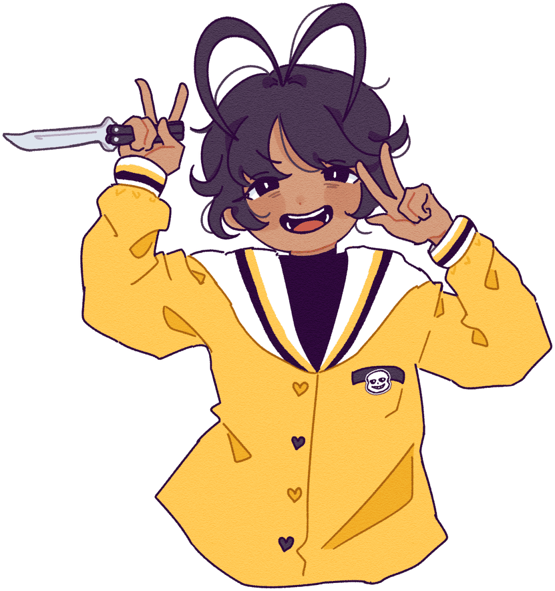 Anyways, up next, I needed to decide on her colour palette. Goki in four different colour schemes I wanted the colours to be visually appealing while also complimenting my theme objectives. Even though I found "Lavender" and "Valentine" to be the cutest of the bunch, I was pouring everything into this unkillable insectoid theme, and such artificial colours just don't mesh. Sadly, pink and purple are too rare in nature to be found on a creepy beetle. Another consideration was values— for example, on paper, it would be annoying to colour in a dark seifuku. On top of that, I don't want her top to blend in too much with her dark skin and hair. So between "Weird Bug" and "Danger Zone," the yellow one became the obvious choice.